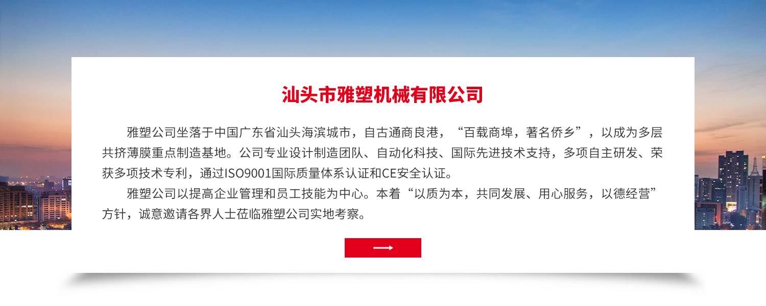 - 雅塑公司坐落于中國廣東省汕頭海濱城市,自古通商良港,“百載商埠,著名僑鄉(xiāng)”,以成為多層共擠薄膜重點制造基地。